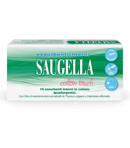 assorbenti interni SAUGELLA cottontouch - Assorbenti interni in cotone, ipoallergenici. Con estratti oleosi di thymus vulgaris ecalendula officialis ad azione antimicrobica, antiodorante e lenitiva. Con olio dimandorle dolci ad azione emolliente e lubrifcinate. Senza applicatore. 3 misure: … ...