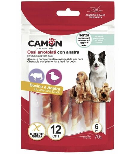CAMON Ossi arrotolati con anatra Rolls di Bovino e Anatra Descrizione Questi ossi arrotolati di pelle bovina con anatra, sono uno sfizioso alimento complementare masticabile per cani. Formula gluten free. Senza additivi. Disponibili in 3 diverse dimensioni. Formato Buste disponibili da 80 g, da 140 g e da 250 g. Cod. AB230 (70) AB231 (140) AB232 (250) ...