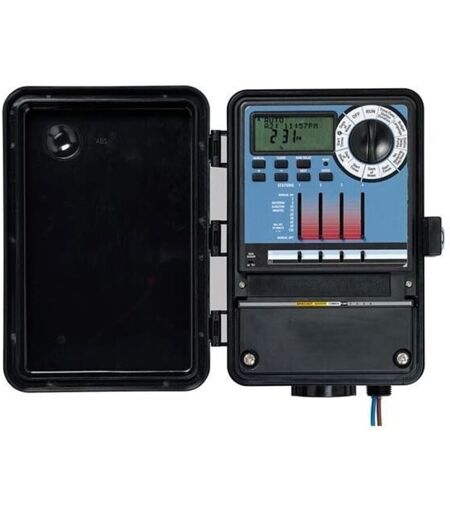 Programmatore alimentato con trasformatore interno da 220/24 V (quindi idonea all'uso in ambiente esterno). Ingressi: sensore pioggia a due fili; comando pompa. Selettori: verticali per l'impostazione dei tempi di irrigazione; verticali per l'impostazione dei programmatori. CARATTERISTICHE Alimentata con trasformatore interno da 220/24 V Ingresso sensore pioggia a 2 fili Ingresso comando pompa Batterie AA alcaline tampone (non fornite) Selettori verticali per l'impostazione dei tempi di irrigazione Selettori verticali per l'impostazioni dei programmatori Commutatori a scorrimento facili da utilizzare Testo interattivo (Inglese, Italiano, Spagnolo) Cabinet stagno per uso gravoso con serratura e chiave PROGRAMMAZIONE Numero programmi 3 con 4 partenze per programma per settore al giorno Tempi di irrigazione da 1 a 120 min per settore Numero di cicli di irrigazione da un min di 1 ogni 14 giorni ad un massimo di 4 al giorno Programmazione settimanale Regolazione stagionale - Memoria non ...