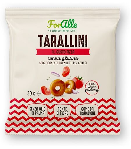 FORALLE TARALLINI ALLA PIZZA Descrizione Snack salato specificamente formulato per celiaci, al rosmarino con olio extravergine d'oliva. Ingredienti Farina di riso, vino bianco (contiene solfiti), fecola di patate, olio d'oliva, farina di mais, farina di ceci, amido di mais, sale, pomodoro 2,6%, cipolla 2,6%, origano 2,6%; addensante: gomma di xantano; paprika, aroma naturale. Può contenere soia, senape, frutta a guscio ( mandorle). Senza glutine. Caratteristiche nutrizionali Valori medi 100 g Energia 1.834 kJ/436 kcal Grassi di cui acidi grassi saturi 14 g 2,3 g Carboidrati di cui zuccheri 68 g 0,9 g Fibre 5,6 g Proteine 6,5 g Sale 3,3 g Conservazione Conservare a temperatura non superiore a 25°C. Validità a confezionamento integro: 9 mesi. Formato Confezione da 30 g. Cod. CTL274 ...