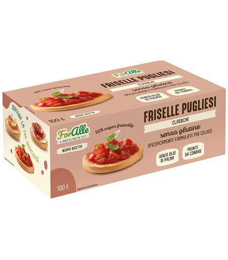 ForAlle FRISELLE PUGLIESI Descrizione Prodotto da forno senza glutine, specificamente formulato per celiaci. Ingredienti Mix di farine senza glutine [amido di frumento deglutinato, amido di mias, destrosio, fibre vegetali (fibre di psyllium, inulina), pasta acida di mais, farina di teff rosso, farina di lenticchie; addensanti: gomma di guar E 412, E 464], acqua, sale, lievito; addensante: E 464. Può contenere senape, latte e prodotti a base di latte. Caratteristiche nutrizionali Valori medi 100 g Energia 1538 kJ / 363 kcal Grassi di cui acidi grassi saturi 0,3 g 0,1 g Carboidrati di cui zuccheri 83 g 4,2 g Fibre 9,0 g Proteine 2,6 g Sale 2,94 g Conservazione Conservare in luogo fresco e asciutto al riparo da fonti di luce e calore. Formato Confezione da 100 g. Cod CFRI100 ...