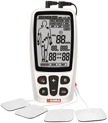 Gima Gima-Care Tens/Ems - 2 Canali - 60 ProgrammiTENS Gima-Care - 60 programmi mediciQuesto dispositivo elettroterapeutico multifunzionale a due canali genera stimoli elettrici per alleviare i dolori e allenare e rilassare i muscoli.Facile da usare, Gima-care ha 2 programmi predefiniti di trattamento con tempo di trattamento regolabile e 1 programma personalizzato per ogni parte del corpo, consentendo di regolare il tempo di trattamento e la frequenza e l'ampiezza degli impulsi.- 3 in 1 Tens + Ems + Massaggio- forma d'onda tens professionale (frequenza e ampiezza variabili degli impulsi)- immagine parti del corpo- 60 programmi (10 parti del corpo, 40 livelli)- elevata potenza d'uscita (max. 120 mA) (a 500 ohm)- design solido e chiaroFunzionamento continuo per circa 10 trattamenti a carica completa.Fornito con 4 placche 50x50 mm, 2 cavi di uscita, 1 cavo USB.Manuale d'uso (Gb, FR, IT, ES, De). ...