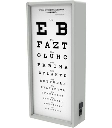 Ottotipo luminoso con lampada a fluorescenza e tavola ottometrica Armaignac 5m. Gli ottotipi luminosi GIMA sono stati progettati osservando le raccomandazioni cliniche al fine di garantire una luce extra bianca e una lettura accurata e precisa di ogni dettaglio. Sono realizzati con uno schermo in materiale acrilico di tipo Altuglass certificato che garantisce una diffusione della luce uniforme ed un elevato contrasto. L'ottotipo è dotato di presa a 3 pin di tipo IEC320 C14 con portafusibili incorporato, interruttore On/Off. Fornito a corredo cavo di alimentazione con presa Schuko. Prodotto in Italia. ...