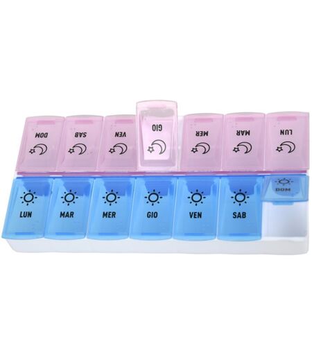 PORTAPILLOLE SETTIMANALE - 7GIORNI x 2 - Descrizione Portapillole con dose giornaliera distribuita in scompartimenti con un colore diverso per mattina e pomeriggio. Le pillole sono chiaramente visibili attraverso coperchi trasparenti e la forma arrotondata è progettata per aiutare l’utente a raggiu… ...