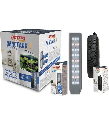 AMTRA Acquario in vetro con angoli frontali arrotondati Nanoctank cubo system 20 completo di luce LED e filtro