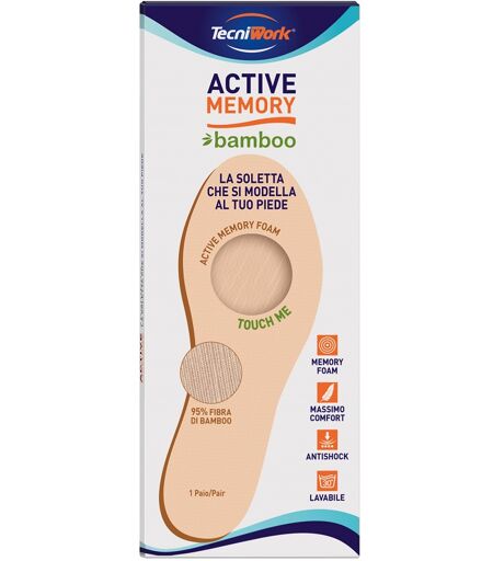 ACTIVE MEMORY bamboo - Descrizione Soletta progettata per il massimo comfort con Tecnologia Memory Foam si adatta in maniera istantanea e reversibile alla forma del piede. Con rivestimento in tessuto 95% fibra di Bambù: delicato sulla pelle morbido e resistente conferisce una piacevole sensazio… ...