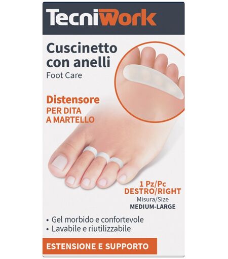 TecniWork - Descrizione Cuscinetto in gel che distende le dita ed evita lo sfregamento contro la calzatura. Ideale in caso di callosità del dorso e delle dita. Gli anelli si applicano al 2° 3° e 4° dito. Dispositivo medico lavabile e riutilizzabile. Modalità d'uso Lavare con acqua e sapone. Asciug… ...