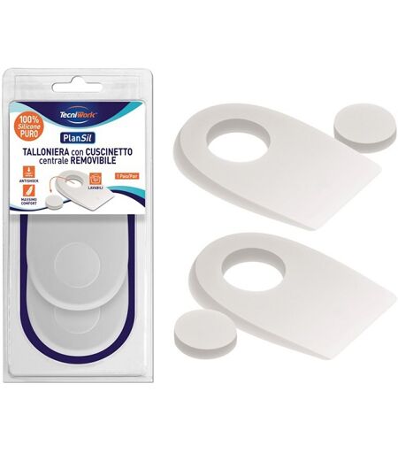 Plansil Talloniera con cuscinetto centrale removibile. - Descrizione Talloniere in silicone con cuscinetto centrale removibile. Riducono i carichi a livello del tallone e grazie alla possibilità di estrarre il cuscinetto sono adatte ad ogni esigenza. La viscoelasticità del materiale ammortizza i … ...
