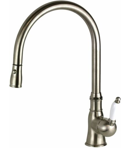 Miscelatore lavello cucina canna alta curva con doccia estraibile a doppio getto stile retrò colore nichel spazzolato Gattoni Rubinetteria ORTA 0240/PCNS Questo miscelatore per lavello cucina ha un design retrò pratico nell'utilizzo grazie alla canna alta orientabile di 360° e doccia estraibile con tasto per azionare il getto spray, La serie ORTA arreda ambienti cucina moderni oppure classici donando un tocco esclusivo senza rinunciare al confort di un prodotto facile da utilizzare. Questo Rubinetto viene lavorato internamente all'azienda con materiali 100% made in Italy, la colorazione viene effettuata con macchinari di ultima generazione nel rispetto delle normative ISO9001 CARATTERISTICHE: Marca: Gattoni Rubinetterie Serie: ORTA Flessibili di collegamento idrico Ø3/8" Gas inclusi Kit di fissaggio incluso Canna girevole di 360° Doccia in ottone doppio getto Maniglia con resina bianca Materiale: ottone Colore: Nichel spazzolato Codice prodotto: 0240/PCNS Questo prodotto gode di una ...