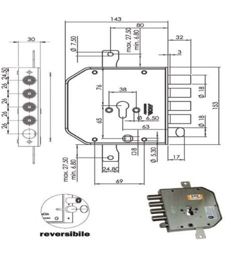 Serratura cilindro europeo a planare Trappola anti effrazione - Fori protettore mm 38 2 chiusure verticali Catenacci laterali 4 pistoni e scrocco reversibile Interasse catenacci mm 26 Scrocco azionato da maniglia quadro mm 8 e chiave Scatola mm 153x143x30 - Entrata mm 63 Cilindro non incluso ...