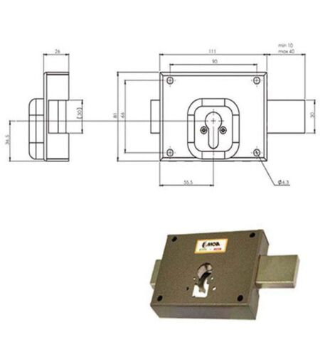 Ferroglietto verniciato marrone - Applicare legnoCatenaccio 4 mandate corsa mm 40 Scatola mm 111x81 - Entrata mm 55,5 Cilindro non incluso Fori protettore mm 38 ...