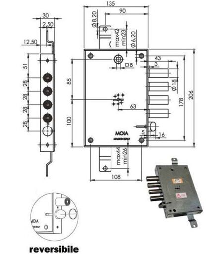 Serratura doppia mappa a planare 2 chiusure verticali Catenacci laterali 4 pistoni e scrocco reversibile Interasse catenacci mm 28 Scrocco azionato da maniglia quadro mm 8 e chiave Scatola mm 135x206x30 - Entrata mm 63 3 chiavi ...