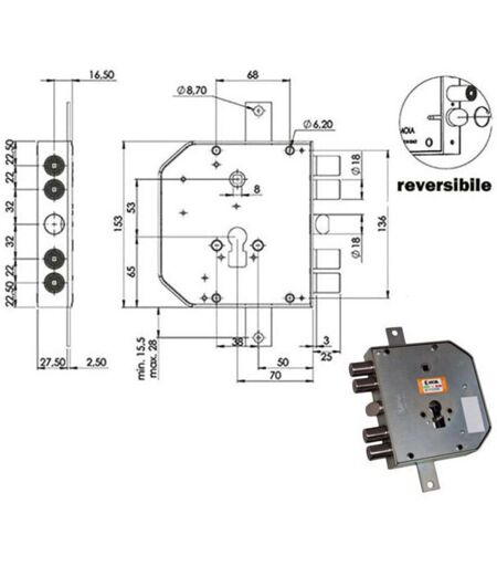 Serratura cilindro europeo a planare Trappola anti effrazione - Fori protettore mm 38 2 chiusure verticali Catenacci laterali 4 pistoni Scrocco centrale reversibile Interasse catenacci mm 22 Scatola mm 137x157x30 - Entrata mm73 Cilindro non incluso ...