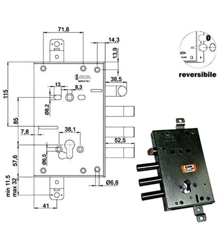Serratura cilindro europeo a planare Movimento adingranaggi Trappola anti effrazione - Fori protettore mm 38 2 chiusure verticali Catenacci laterali 3 pistoni e scroccoreversibile Interasse catenacci mm 38 - Sporgenzamm 21,5 Scrocco azionato da maniglia quadro mm 8 e chiave Scatola mm 135x206x30 - Entrata mm 63 Cilindro non incluso ...