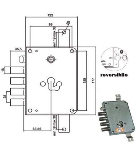 Serratura cilindro europeo a planare Movimento adingranaggi Fori protettore mm 38 2 chiusure verticali Catenacci laterali 4 pistoni e scrocco superiore reversibile Interasse catenacci mm 28 Scatola mm 122x177x30 - Entrata mm 63 Cilindro non incluso ...
