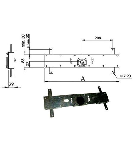 Serratura a spranga per porte basculanti Trappolaanti effrazione - Fori protettore mm 38 4 punti di chiusura: 2 inferiori - 2 superiori Sbloccaggio interno/esterno con chiave Pz 4 aste verticali incluse Maniglia esterna e interna non inclusa Scatola mm 500x83 Cilindro non incluso ...