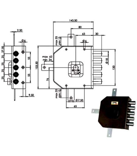 Serratura cilindro europeo applicare legno Trappola anti effrazione - Fori protettore mm 38 4 chiusure verticali Catenacci laterali 5 pistoni Interasse catenacci mm 25 Scatola mm 143,5x153,5x29 - Entrata mm 63 Aste, deviatore e cilindro non inclusi ...