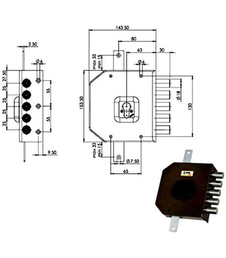 Serratura cilindro europeo applicare legno Trappola anti effrazione - Fori protettore mm 38 2 chiusure verticali Catenacci laterali 5 pistoni Interasse catenacci mm 25 Scatola mm 143,5x153,5x29 - Entrata mm 63 Aste e cilindro non inclusi ...