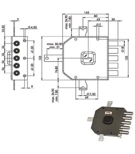 Serratura doppia mappa applicare legno 4 chiusureverticali Catenacci laterali 5 pistoni Interassecatenacci mm 26 Scatola mm 143,5x153,5x29 - Entrata mm 63 Dimensioni canotto mm 30x59 3 chiavi Astee deviatore non inclusi ...