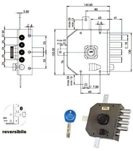 Serratura pompa chiave punzonata applicare legno 4 chiusure verticali - Pomolo interno Catenacci laterali 4 pistoni e scrocco reversibile Interasse catenacci mm 25 Scatola mm 143,5x153,5x29 - Entratamm 63 Dimensioni cilindro mm 30x59 3 chiavi + chiave cantiere Aste e deviatore non inclusi ...