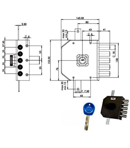 Serratura pompa chiave punzonata applicare legno 2 chiusure verticali - Pomolo interno Catenacci laterali 5 pistoni Interasse catenacci mm 25 Scatolamm 143,5x153,5x29 - Entrata mm 63 Dimensioni cilindro mm 30x59 3 chiavi + chiave cantiere Aste non incluse ...
