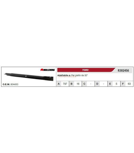 Lama per trattorino tagliaerba tosaerba rasaerba piatto da 32" A: 797mm B: 16mm C: D: E: 5mm F: 63mm A: lunghezza diagonale lama B: Ø foro centrale C: Ø fori di posizionamento D: interasse fori di posizionamento E: spessore lama F: larghezza lama TORO Codice: R302456 Codice originale: 804430 AT ...