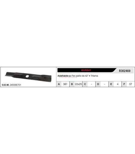 Lama per trattorino tagliaerba tosaerba rasaerba PER PIATTO DA 42" trilama A: 381mm B: 22x25mm C: D: E: 4mm F: 57mm A: lunghezza diagonale lama B: Ø foro centrale C: Ø fori di posizionamento D: interasse fori di posizionamento E: spessore lama F: larghezza lama MTD Codice: R302469 Codice originale: 24558E701 AT ...