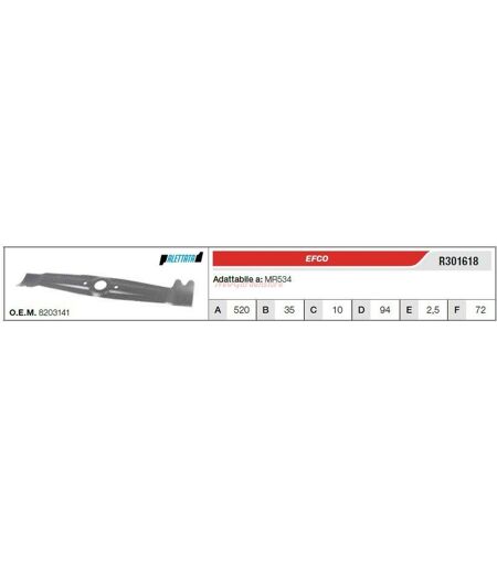 Lama per tagliaerba tosaerba rasaerba MR534 ORIGINALE EFCO OLEOMAC EMAK A lunghezza diagonale lama: 520mm B Ø foro centrale: 35mm C Ø fori di posizionamento: 10mm D interasse fori di posizionamento: 94mm E spessore lama: 2.5mm F larghezza lama: 72mm EFCO Codice: R301618 Codice originale: 8203141 COMPATIBILE ANCHE CON OLEOMAC LUX 53 R.O: 8203141 AT ...