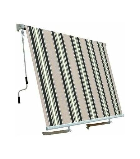 Tenda a caduta con bracci H. 250 L. 300 colore Riga Verde rullo in alluminio diametro 60 mm, attacco a parete incluso, composizione in poliestere 280 gr/m², asta di manovra inclusa, barra frontale in alluminio 45x25 mm. ...