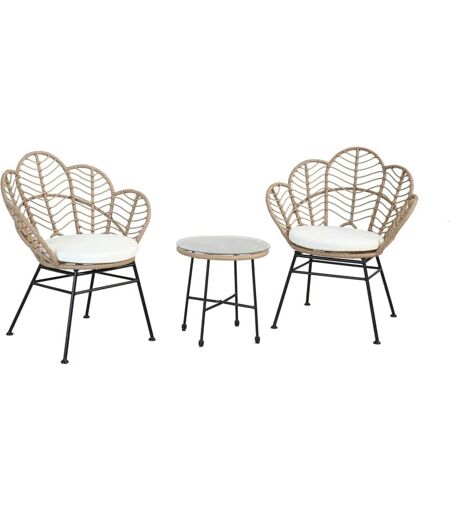 Struttura in acciaio verniciato nero, seduta in polyrattan color naturale completa di cuscini di colore bianco. Tavolino tondo con top in vetro temperato spessore 5 mm. Il set è composto da un tavolo (h45x45x45 cm) e due sedie (h86x64x74 cm) ed è contenuto in un unico cartone. ...