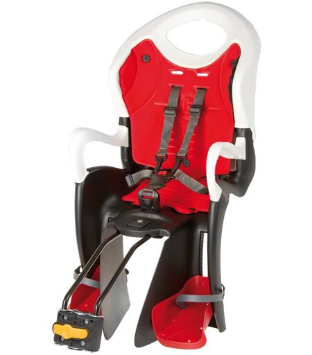 Portabebé posteriore. Plastica bianca/nera, copertura rossa, piedi rossi, con staffa per fissaggio rapido al tubo della sella (con forcella in ferro flessibile), altezza dei poggiapiedi regolabile in continuo, carico massimo: 22 kg, EN14344. ...