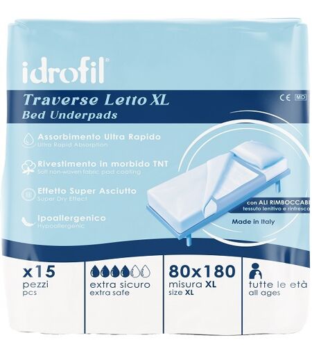 Idrofil - Descrizione Traversa letto XL. Costituite da una struttura multistrato composta da: 1° strato: in morbido tessuto TNT anallergico e leggero; 2° strato: in viscosa con polimeri super assorbenti che garantiscono un veloce ed efficace assorbimento; 3° strato: in tessuto impermeabile per la p… ...