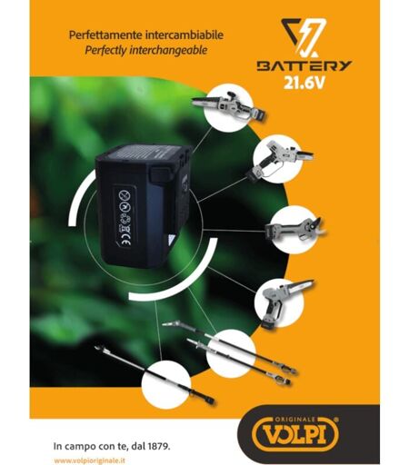 VOLPI V.BATTERY 21.6 Tempo di ricarica: 4 ore Potenza KV380R70: 54.0Wh Potenza KVS2000R70: 86.4Wh Voltaggio KV380R70: 21.6 V - 2.5Ah Voltaggio KVS2000R70: 21.6 V - 4.0Ah Tensione nominale carica batteria: 100-240V AC - 50-60Hz Descrizione prodotto Batteria unica. Molteplici utensili. Ecco V.Battery in versione 21.6V di Volpi Originale V.Battery è l'innovativa batteria ricaricabile pensata da Volpi per funzionare su più prodotti Volpi. Leggera e compatta, è compatibile al 100% con gli utensili Volpi predisposti e garantisce ottime prestazioni e alta affidabilità. V.Battery è ideale per unire le diverse esigenze hobbistiche e professionali alla praticità e risparmio di un'unica batteria multi-utensile. Disponibile in 2 versioni: KV380R70 e KVS2000R70, in base alla potenza necessaria. 100% compatibile Dimenticate batterie diverse per ogni utensile: V.Battery è stata pensata per essere utilizzabile su più prodotti Volpi, offrendo sempre la massima compatibilità. Articoli compatibili: ...