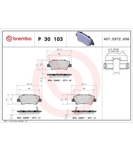 Altezza [mm]: 41. Articolo complementare/info integrativa: con accessori. Articolo complementare/info integrativa 2: con lamierino anticigolío. Contatto avvisatore usura: con segnalatore acustico usura. Indice: P 30 103. Larghezza [mm]: 100. Numero del Produttore: P 30 103. N° visualizzazioni usura [per asse]: 2. N° wva: 22656, 22657, 22655. Produttore: BREMBO. Sistema frenante: Akebono. Spessore [mm]: 15. ...
