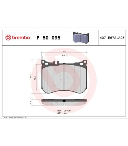Altezza [mm]: 98. Articolo complementare/info integrativa: senza accessori. Contatto avvisatore usura: Predisposto per contatto segnalazione usura. Indice: P 50 095. Larghezza [mm]: 132. Numero del Produttore: P 50 095. N° wva: 25179. Produttore: BREMBO. Sistema frenante: BREMBO. Spessore [mm]: 18. ...
