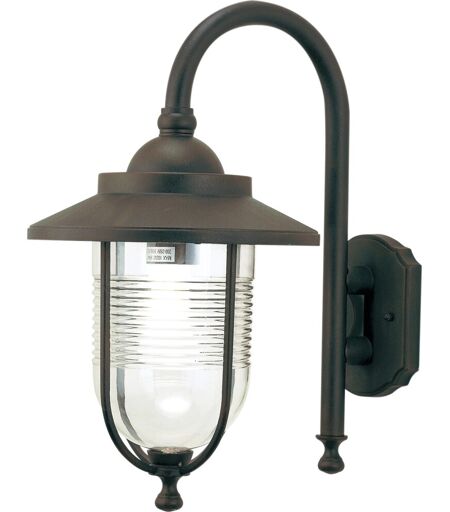 Applique grande rivolta in basso della linea Porto, con struttura in pressofusione di alluminio, trattamento anticorrosivo e verniciatura a polveri epossidiche. Diffusore in termoplastico trasparente con copri portalampada di alluminio in tinta, controbase di fissaggio in termoplastico e portalampada in porcellana con attacco E27. Adatta per lampade ad incandescenza e risparmio energetico. Colore: ruggine.- Classe di protezione IP43, wattaggio massimo di 100 W e classe energetica compatibile B. ...