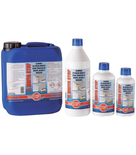 MUFFA STOP LT.5 Il Muffa Stop è un detergente a base di cloro attivo concentrato, che elimina, combatte e previene, la formazione e la crescita di muffe, alghe e muschi, in modo radicale e in pochi minuti, sia in interni che esterni. E’ pronto all’uso e si applica spruzzando, sull'intera superficie ammuffita da trattare, un leggero velo di prodotto, quindi si lascia agire 5/10 minuti e, a superficie asciutta, si eliminano eventuali residui di prodotto con un panno umido. CONFEZIONE DA LT.5 ...