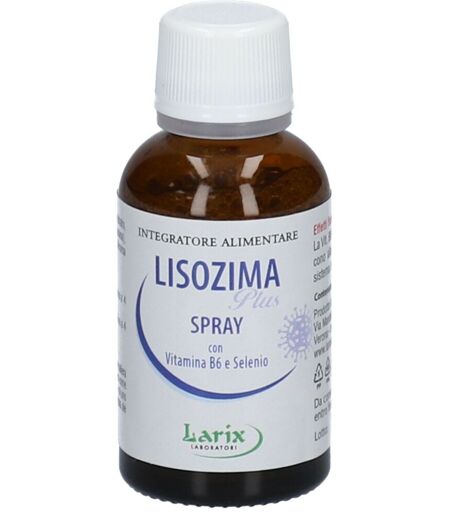 Gli integratori non sostituiscono un’alimentazione equilibrata e variegata e uno stile di vita sano. Regola le difese immunitarie ed ostacola l’entrata dei virus nell’organismo. Ingredienti:Acqua, Lisozima cloridrato, Vit. B6. Conservante: potassio sorbato, aroma arancio, Selenio lievito 0,2%. Analisi media Per 8 spruzzi (1 ml) *Vnr% Lisozima cloridrato 35 mg Vit. B6 5 mg 357 Selenio 100 mcg 180 *Vnr = Valori Nutritivi di Riferimento Modo d'uso:Spray gola: 2 spruzzi fino a 4 volte al giorno secondo il bisogno. E’ possibile, per una ancor maggiore sicurezza, anche l’utilizzazione contemporanea per naso e gola. Spray nasale: 1 spruzzo per narice fino a 4 volte il giorno secondo il bisogno. Avvertenze:Non superare la dose giornaliera raccomandata.Tenere fuori dalla portata dei bambini al di sotto dei tre anni. Conservazione:Conservare in luogo fresco ed asciutto al riparo dalla luce, dalle fonti di calore localizzate e dai raggi solari ed evitare il contatto con l’acqua. Contenuto netto:30 ml Produttore:Larix laboratori Srl Via Mandella, 603 37050 Isola Rizza VR Italia ...