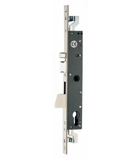 Elettroserratura da infilare per montanti. 1 mandata, triplice, con aggancio aste a vite, catenaccio rotante, scrocco autobloccante con richiamo a impulso elettrico, chiave o quadro maniglia, frontale inox, scatola mm. 50x230, tensione 12 V ca. Art. 783802 cod. 22855 E. mm. 35 - F. mm. 22 cf/pz 1 ...