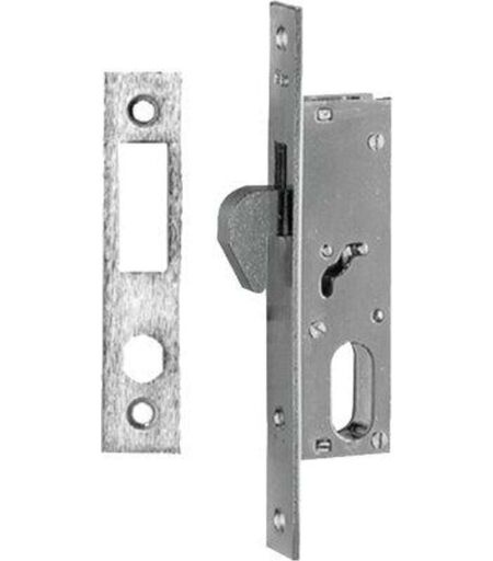 Per cilindro ovale. Chiusura a 1 mandata. Catenaccio a gancio con punta smussata. Frontale in acciaio cromato con bordo quadro da Mm. 20x160. Altezza scatola Mm. 104. In dotazione: 1 contropiastra. ...