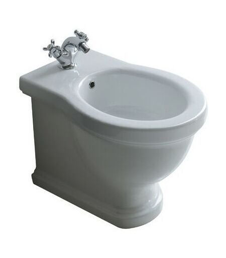 Bidet a terra distanziato da muro tre fori della serie Ethos di Ceramica Galassia. Il bidet è in ceramica bianco lucido, cm. 55x38xh42 Bidet sanitario a terra distanziato con tre fori per rubinetteria, in ceramica, colore bianco lucido I sanitari della collezione Ethos, grazie alle loro linee tradizionali ed intramontabili portano al bagno un ambiente classico, elegante ed importante. Non sono compresi con il bidet e sono da acquistare a parte:il fissaggio per bidet a terra; il miscelatore monoforo per il bidet (con o senza piletta di scarico); il sifone per il bidet; la piletta click clack per il bidet se non compresa con il miscelatore. Da scegliere tra la versione con tappo cromato o con tappo in ceramica; 2 rubinetti filtro da installare filomuro a cui vanno allacciati i flessibili del miscelatore ...