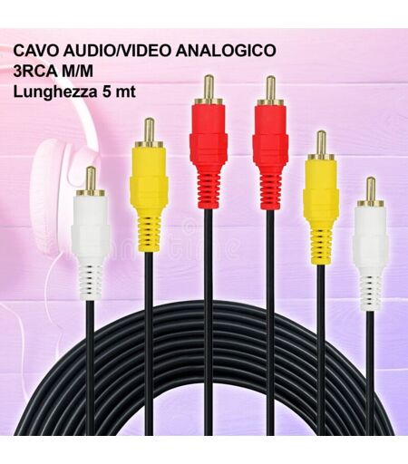 Questo cavo RCA triplo è di solito utilizzato per collegare lettori DVD, sistemi Home Cinema, proiettori ecc alla TV o ad impianti Stereo Hi-Fi e amplificatori. Lunghezza cavo: 5 metri.Cavo utile per collegare apparati audio video con uscita di tipo RCA come: Fotocamera digitale, Videocamera e telecamera Lettore MP3 / MP4, Autoradio, Impianti Stereo Hi-Fi, Microfono, Cuffie, Casse Speaker Telefono Cellulare, Smartphone, Iphone, Ipod, Ipad, Iphone Console e videogiochi quali Sony Play Station PS3 / PS4 / Xbox 360 / One Tablet, Computer, PC Notebook, Netbook, Pda, Box Multimediali Lettore DVD / HD-DVD / Blu-Ray e Videoregistratore VHS, Decoder digitale terrestre Televisore, TV Full HD, LED, Plasma, 3D, Video proiettore Impianti Home cinema, Home theatre Monitor TFT, LCD Schede grafiche ...