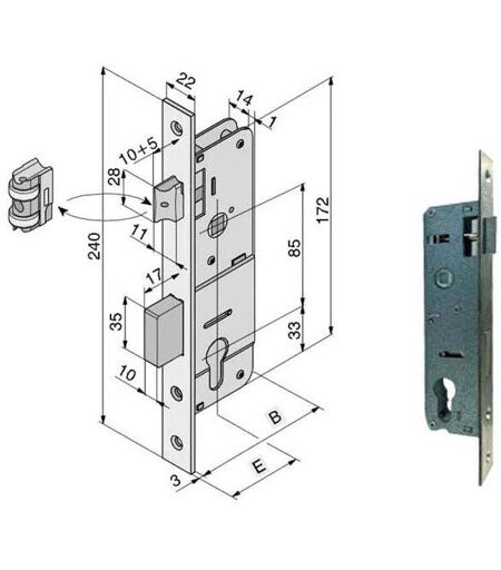 Serratura montanti alluminio infilare Frontale acciaio nichelato Senza incontro e rullo 1 mandata - Scrocco reversibile - Quadro mm 8 Scrocco o rullo regolabile intercambiabile Scatola mm 33/37/42/47x172 - Frontale mm 22x240 ENtrata mm 20/25/30/35 - Cilindro 700 non incluso ...