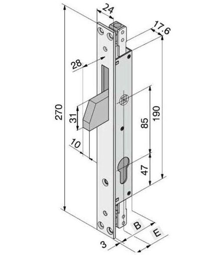 Serratura grate/persiane blindate infilare Acciaio nichelato - Senza incontro Catenaccio spina antitaglio Aste interne comandate da quadro maniglia Bloccaggio aste interne con cilindro Scatola mm 28x190 - Frontale mm 24x270 Cilindro 601.22.05.1 non incluso ...