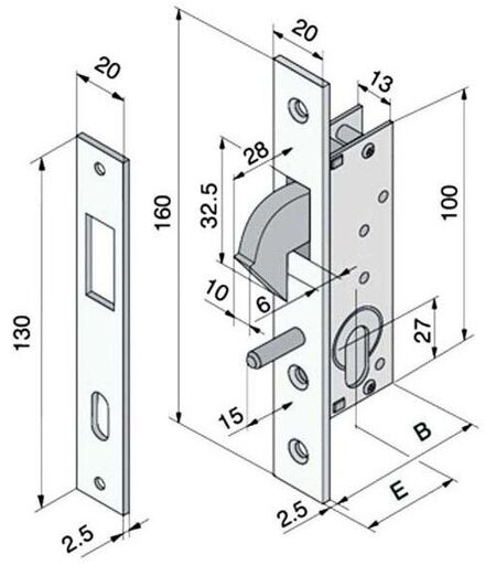 Serratura montanti alluminio infilare Acciaio nichelato - Incontro Gancio rientrante - Perno guida Scatola mm 43/61x100 - Frontale mm 20x160 ENtrata mm 16/25 - Cilindro serie 702 non incluso ...