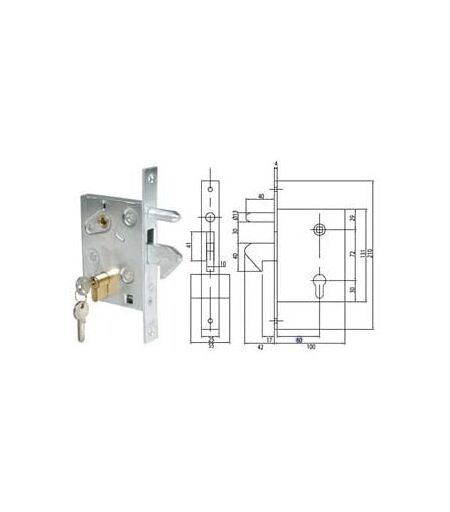mm.60 (447) scatola frontale e contropiastra in acciaio zincato, catenaccio a 1 mandata e mezzo giro, quadro maniglia mm.8 con cilindro sagomato mm.54 (27x27) con 3 chiavi frontale mm.25x210 Pezzi per confezione primaria: 1,0 Larghezza 15,3 Lunghezza 21,9 Altezza 3,2 Peso 1,233 ...