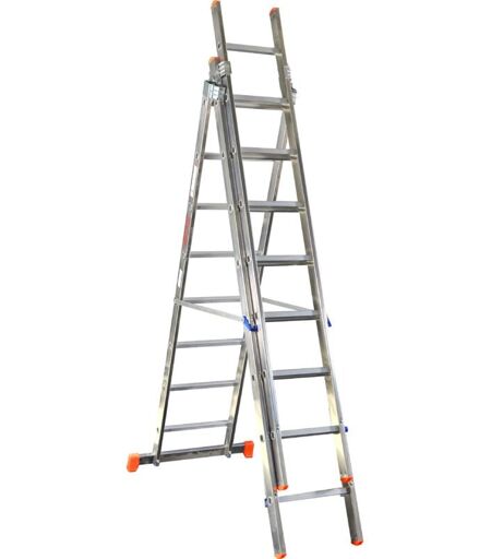Professionale, trasformabile sia in scala d'appoggio che doppia con quardacorpo di protezione. Montante in alluminio elettrosaldato con profilo montante esterno grecato per una presa sicura, piolo a sezione quadrata mm.28x28 in alluminio estruso antisdrucciolo, cerniera in acciaio con agevolatore di apertura, cinghie antiapertura, base allargata per una maggiore stabilit… con tacchi ergonomici maggiorati, chiavette e bulloneria per montaggio in dotazione. Portata kg 150. Conforme alle norme UNI EN 131. ...