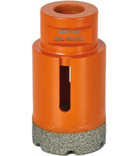 Fresa diamantata per smerigliatrice Battipav HG40D. Attacco utensile M14. Utilizzo a secco. Diametro: 40 mm Giri al minuto: 10000 - 12000 rpm Interfaccia: M14 Spessore max di taglio: 50 mm Materiali: gres porcellanato, pietra naturale, granito, marmo. ...