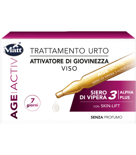 Trattamento Con Siero Di Vipera 3 Alpha Plus Dai laboratori di ricerca cosmetica Matt nasce l’innovativo AGEACTIV Trattamento Urto Attivatore di Giovinezza Viso Siero di Vipera 3-alpha plus che, grazie alla sua esclusiva formula potenziata dallo Skin-Lift, aiuta a rallentare la formazione delle rughe di espressione donando un effetto tensore per una pelle liscia e distesa. Il Trattamento Urto Attivatore di Giovinezza Viso è un esclusivo mix di principi attivi: * Siero di Vipera 3-alpha plus: è una combinazione di 3 aminoacidi dal ridotto peso molecolare in grado di riprodurre un effetto simile al siero della vipera presente in natura aiutando a contrastare i segni del tempo per una pelle più distesa e rilassata. * Skin-Lift: è un mix di peptidi con attività «Botox Like» in grado di agire sulle rughe di espressione aiutando a distenderle per un effetto lifting immediato. Benefici Pelle dall’aspetto più giovane. Esercita un effetto tensore sulle rughe di espressione. Distende ...
