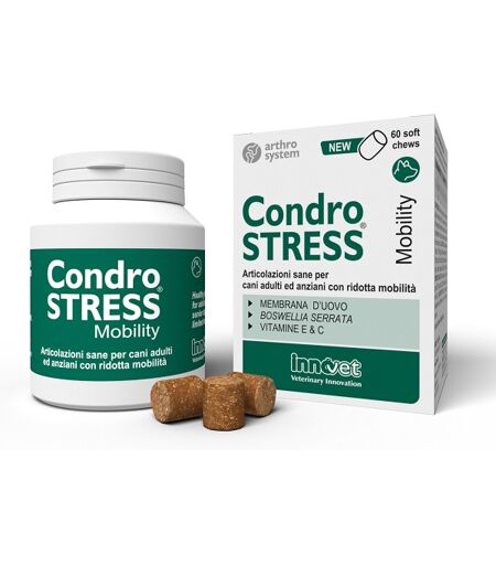 CondroSTRESS Mobility - Descrizione Mangime complementare per supportare la corretta funzione articolare di cani adulti e anziani con ridotta mobilità. La membrana d'uovo costituisce una fonte di collagene, con i glicosaminoglicani e aminoacidi solforati. La vitamina E e la vitamina C svolgono funz… ...